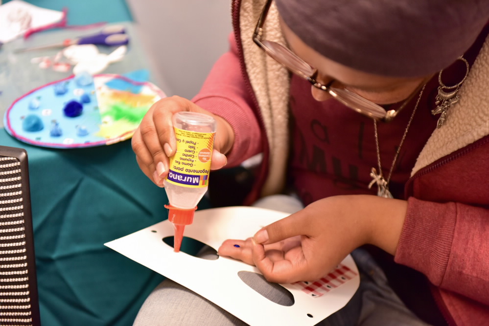 Con el ingrediente del arteterapia los talleres son mucho más coloridos. De esto se encarga Claudia que, a través de mostacillas y plumas buscó que los asistentes manifestaran sus emociones y las compartieran con sus compañeros.